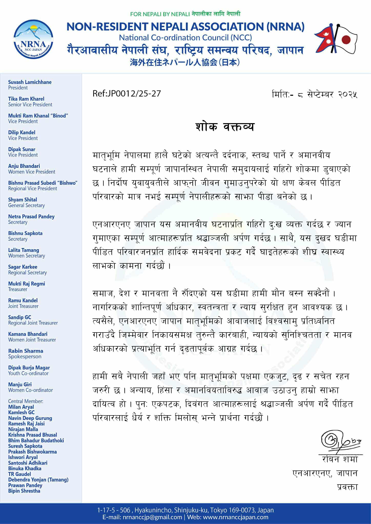 नेपालमा घटेको दर्दनाक घटनाप्रति एनआरएनए जापानको शोक, अपराधीलाई कानुनी कारबाही गर्न जोड